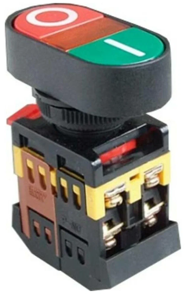Кнопка «Пуск-Стоп» на 220 В — это устройство для ручного управления электрическими цепями, позволяющее включать и останавливать оборудование. Она обычно имеет два элемента: один для запуска (зелёный, нормально открытый контакт — NO), другой для остановки (красный, нормально закрытый контакт — NC). Такие кнопки применяются в промышленных системах, на пультах станков, конвейеров, насосов и другого оборудования с одноканальным управлением.