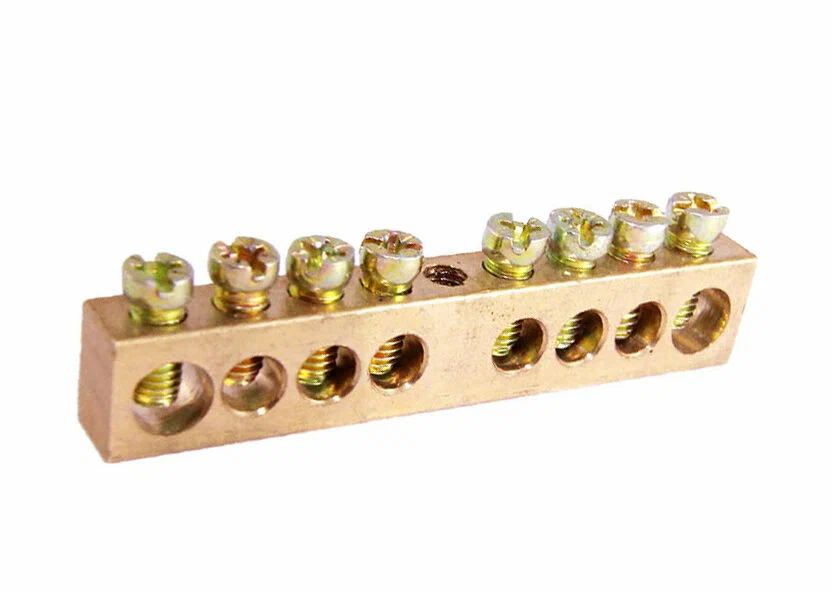 Нулевая шина (терминал) 6×9-8 предназначена для присоединения нулевых рабочих (N) и защитных (PE) проводников в щитовом оборудовании. Изделие выполнено из высококачественной электротехнической латуни, имеет сечение 6×9 мм и рассчитано на 8 групп подключений. Данная модификация поставляется без изолятора и предусматривает крепление через одно или два центральных отверстия непосредственно к монтажной панели или на одну опорную стойку. Шина обеспечивает надежный электрический контакт, упорядочивает разводку проводов внутри щита и рассчитана на номинальный ток до 100 А.
